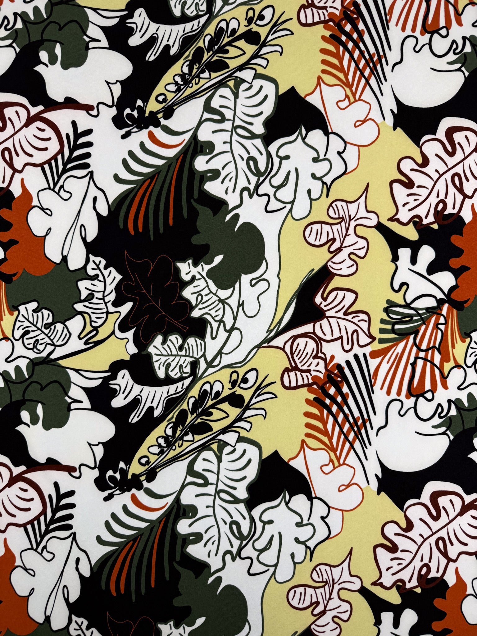 Our Printed Lycra is a Polyester/Spandex fabric that has a two-way stretch and comes in a variety of beautiful prints! Printed Lycra is a medium-weight fabric, has good durability and stretch, and washes well. Our Lycras are perfect for making tops, dresses, skirts, pants, accessories, and even childrenswear. This vibrant botanical print features oversized tropical leaves layered in a bold, graphic composition.