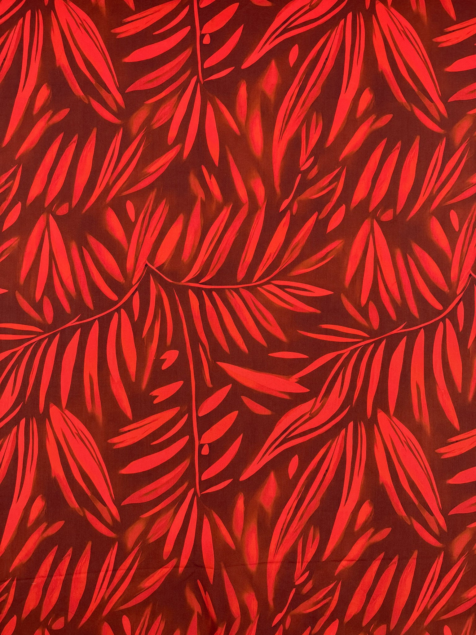 Our Designer Rayon showcases a beautiful and colourful fabric with vibrant prints that can be used for various purposes such as dresses, skirts, blouses, curtains, and more. Our collection showcases a soft, lightweight fabric with a smooth drape and a luxurious feel. Overall, rayon fabric offers both comfort and style, making it a versatile choice for any project. Crimson Palm showcases a bold tropical leaf design in radiant shades of crimson and red, contrasted beautifully against a deep brown base.