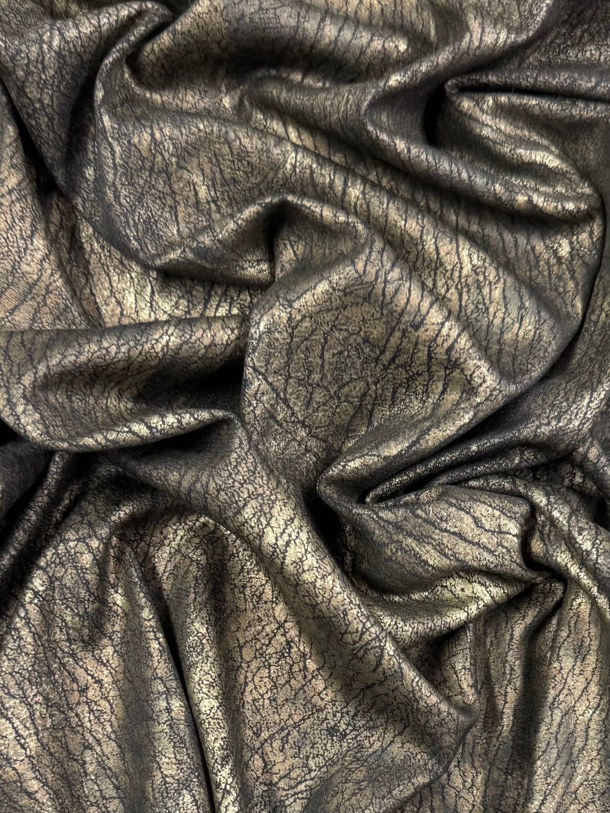 A close-up of the Evening Lycra - Rolled Gold fabric by Super Cheap Fabrics showcases its textured black Polyester/Spandex blend adorned with horizontal gold metallic patterns. This medium-weight fabric features abstract and irregular designs, offering a reflective and artistic effect across its 160cm surface.