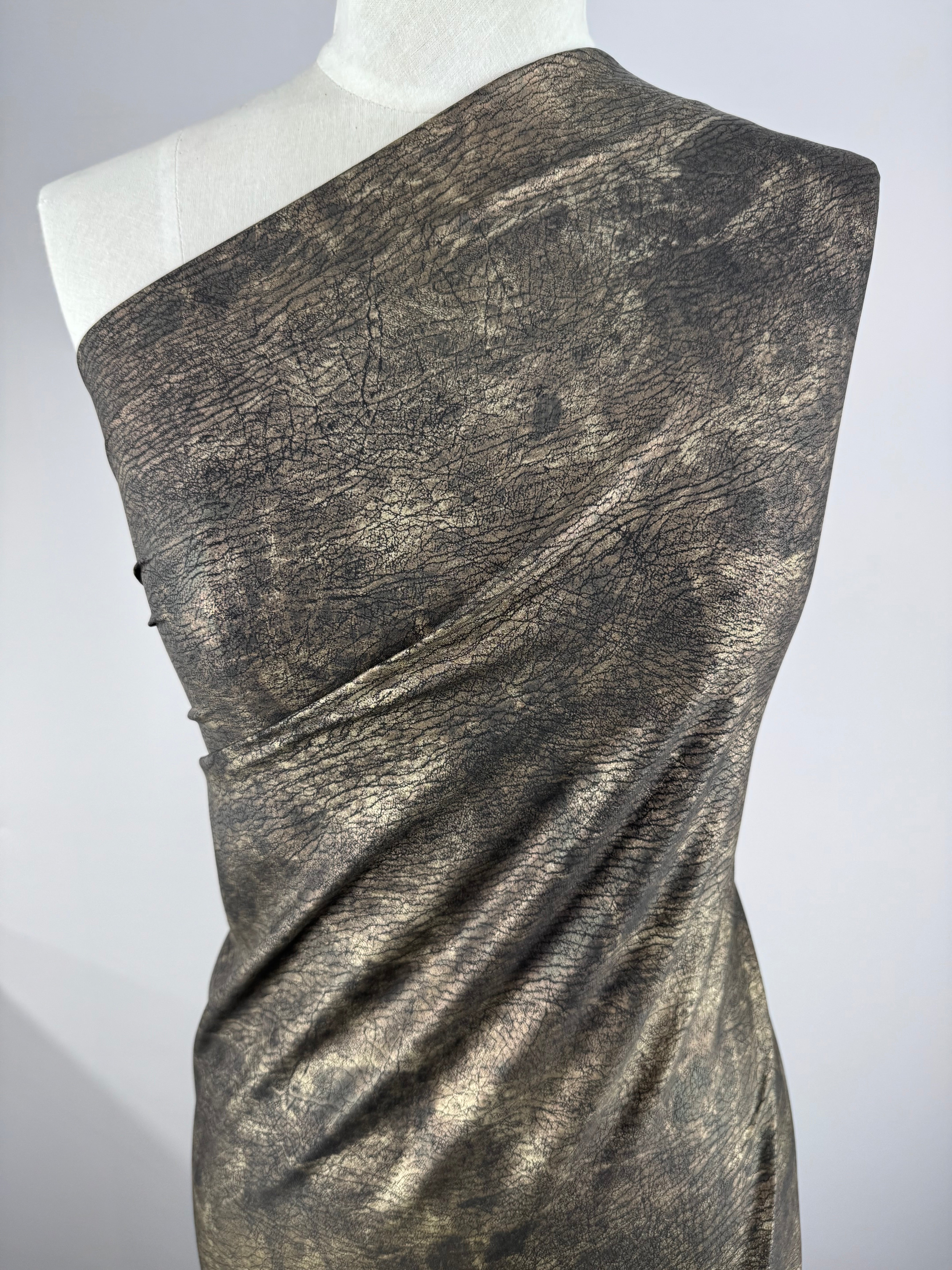 A mannequin adorned in the Evening Lycra fabric by Super Cheap Fabrics, showcasing a medium-weight blend of Polyester and Spandex with a metallic gold abstract splatter resembling brush strokes. The material, known as Rolled Gold, is elegantly draped to cover the top and flows gracefully.