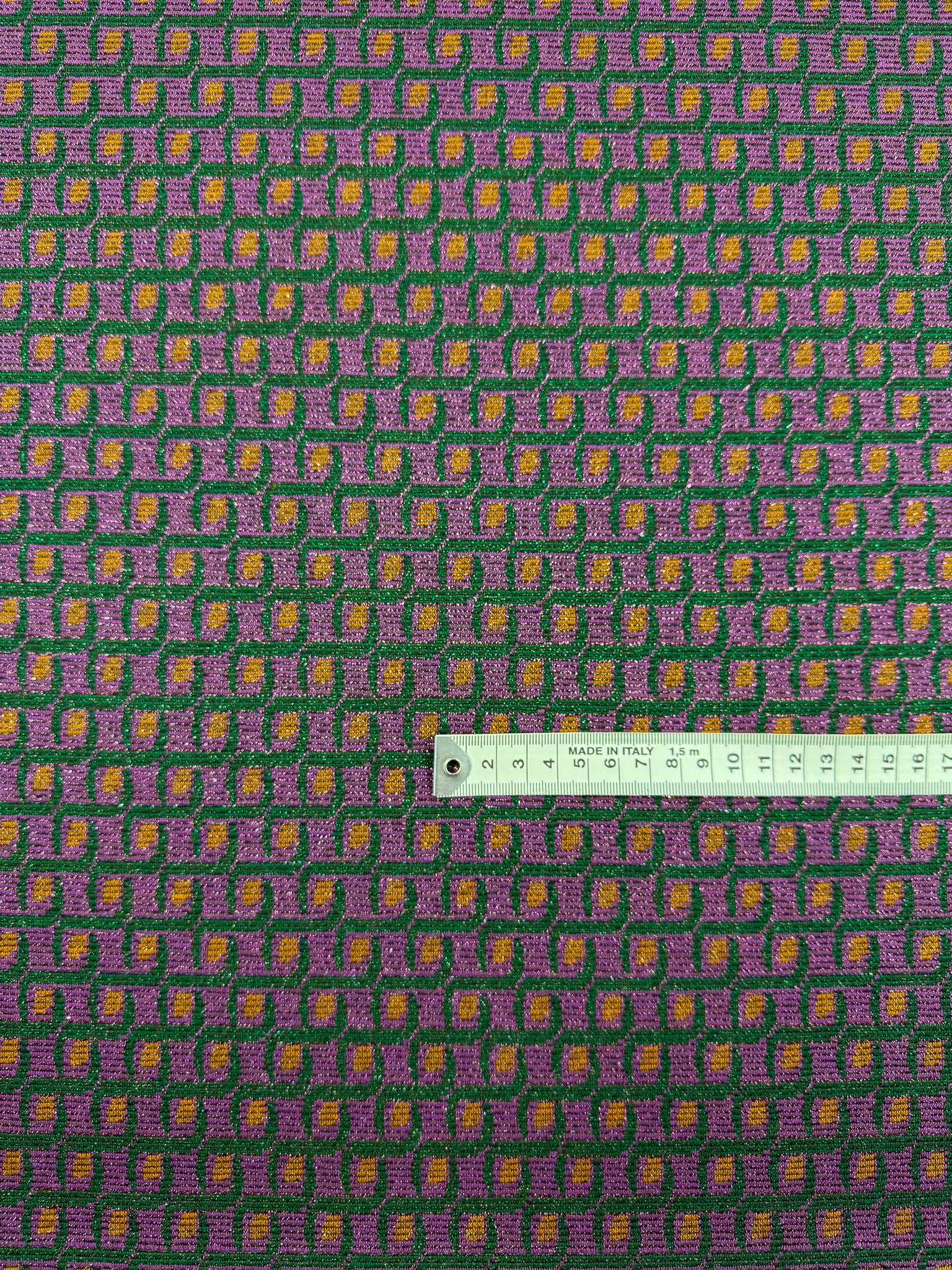 A lurex knit fabric with a geometric pattern in purple, green, and gold with a luxe woven texture.