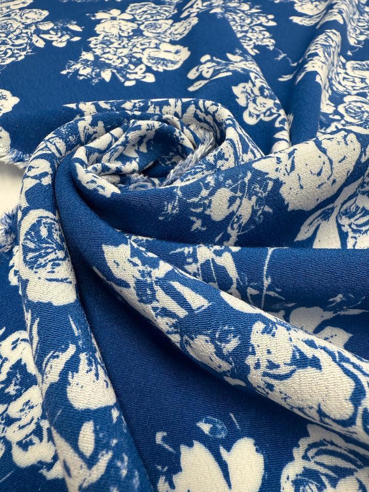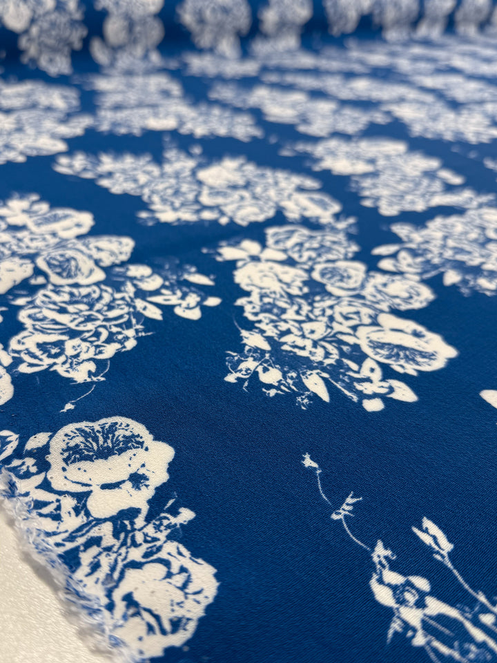 Designer deadstock haul from Prato, Italy. A printed viscose fabric ivory floral clusters on deep blue base.