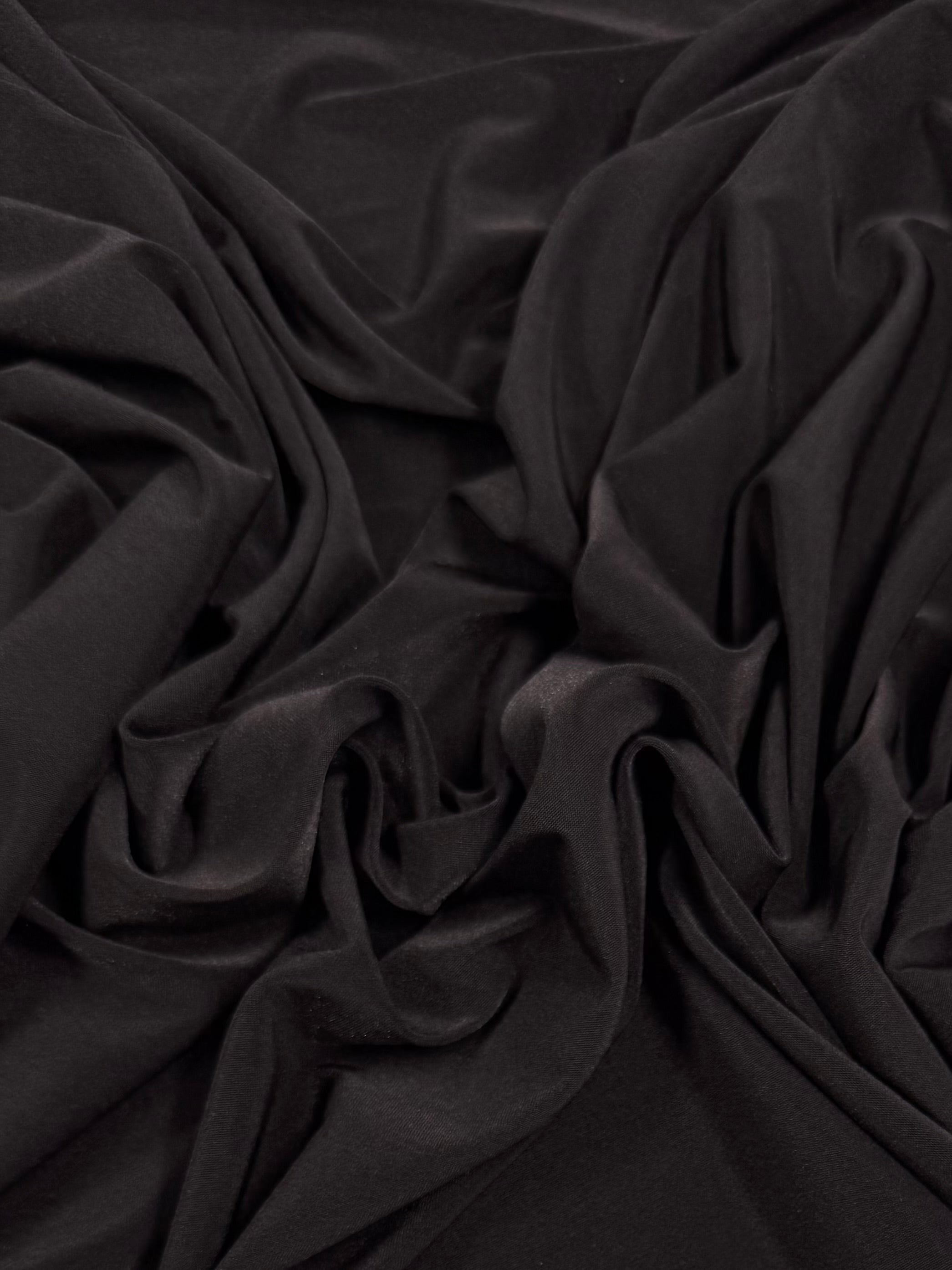 A close-up of Slinky Knit - Chocolate - 135cm by Super Cheap Fabrics with visible ribbed texture, gathered and draped in soft folds and wrinkles. The medium-weight material appears soft and plush, displaying its characteristic horizontal lines and creating a sense of depth and richness.
