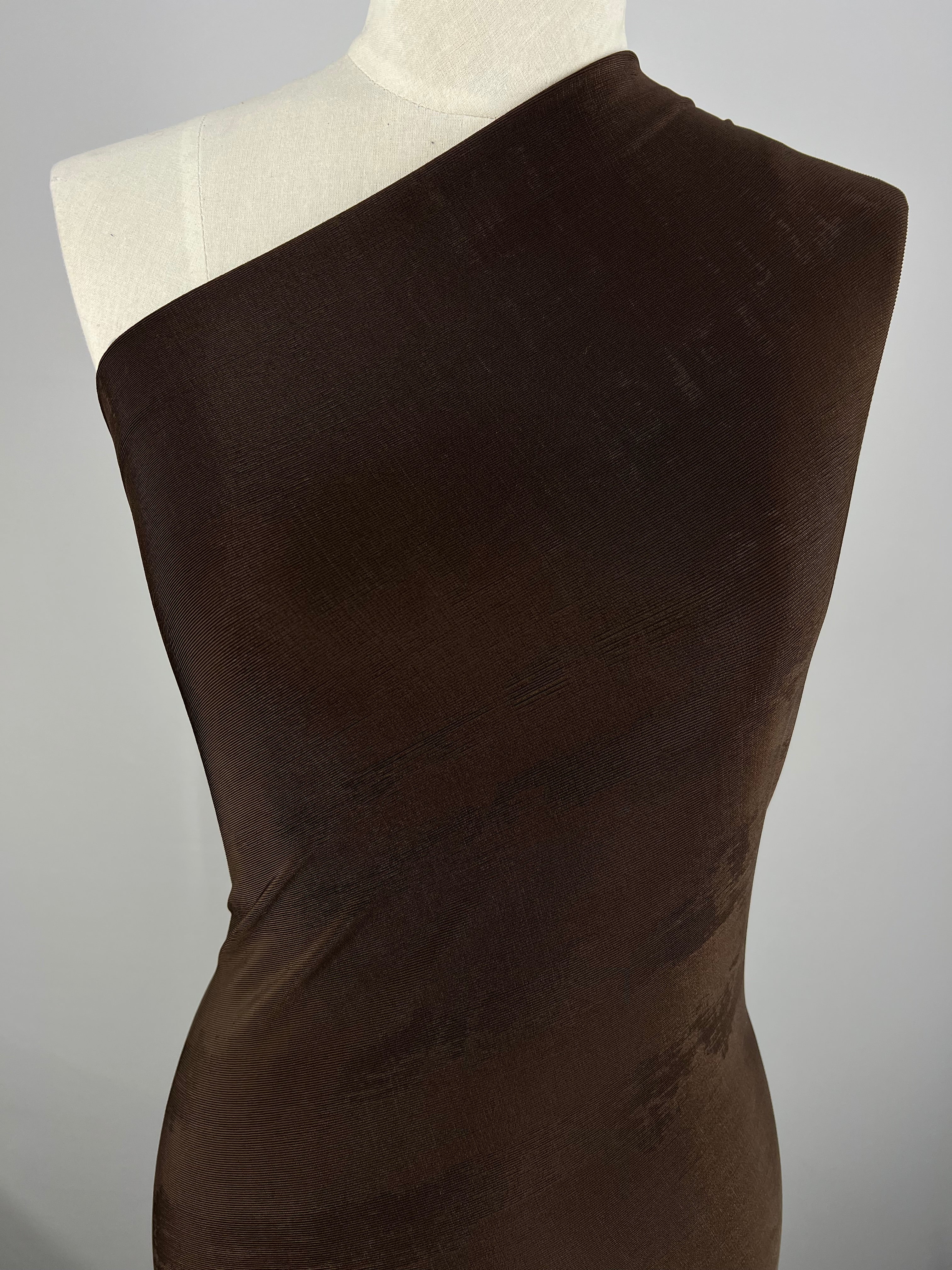 A mannequin is draped in a dark chocolate color, one-shoulder polyester fabric called Slinky Knit - Chocolate - 135cm by Super Cheap Fabrics that wraps around the torso. The smooth medium weight fabric appears to have a slight sheen, creating a subtle textured pattern under the light. The background is plain and grayish, focusing attention on the fabric and mannequin.
