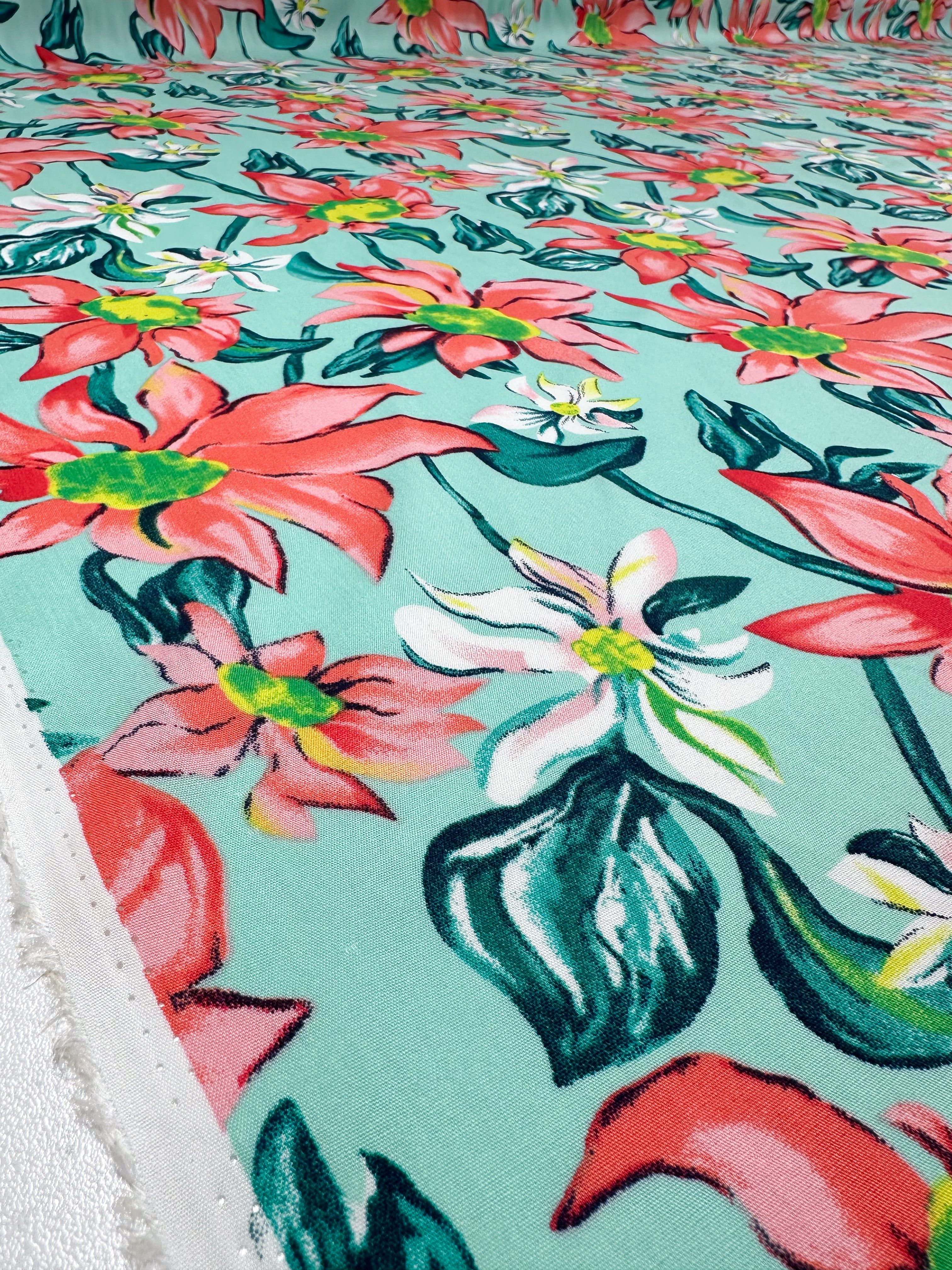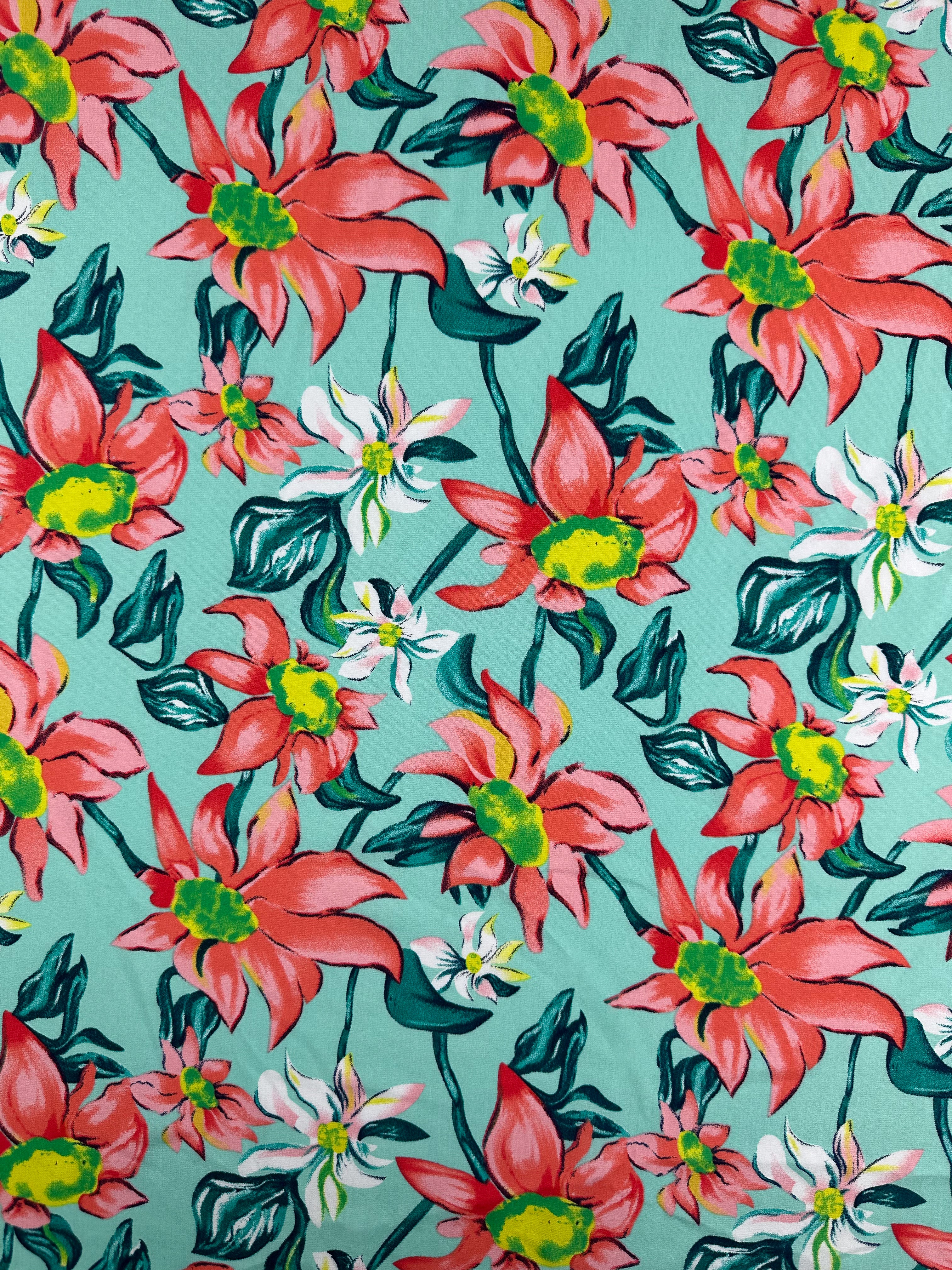 Close-up of Super Cheap Fabrics' Designer Rayon - Tropical Blossom (145cm), showcasing vibrant red, pink, and white floral prints with green leaves on aqua fabric, featuring a bold repeating pattern.