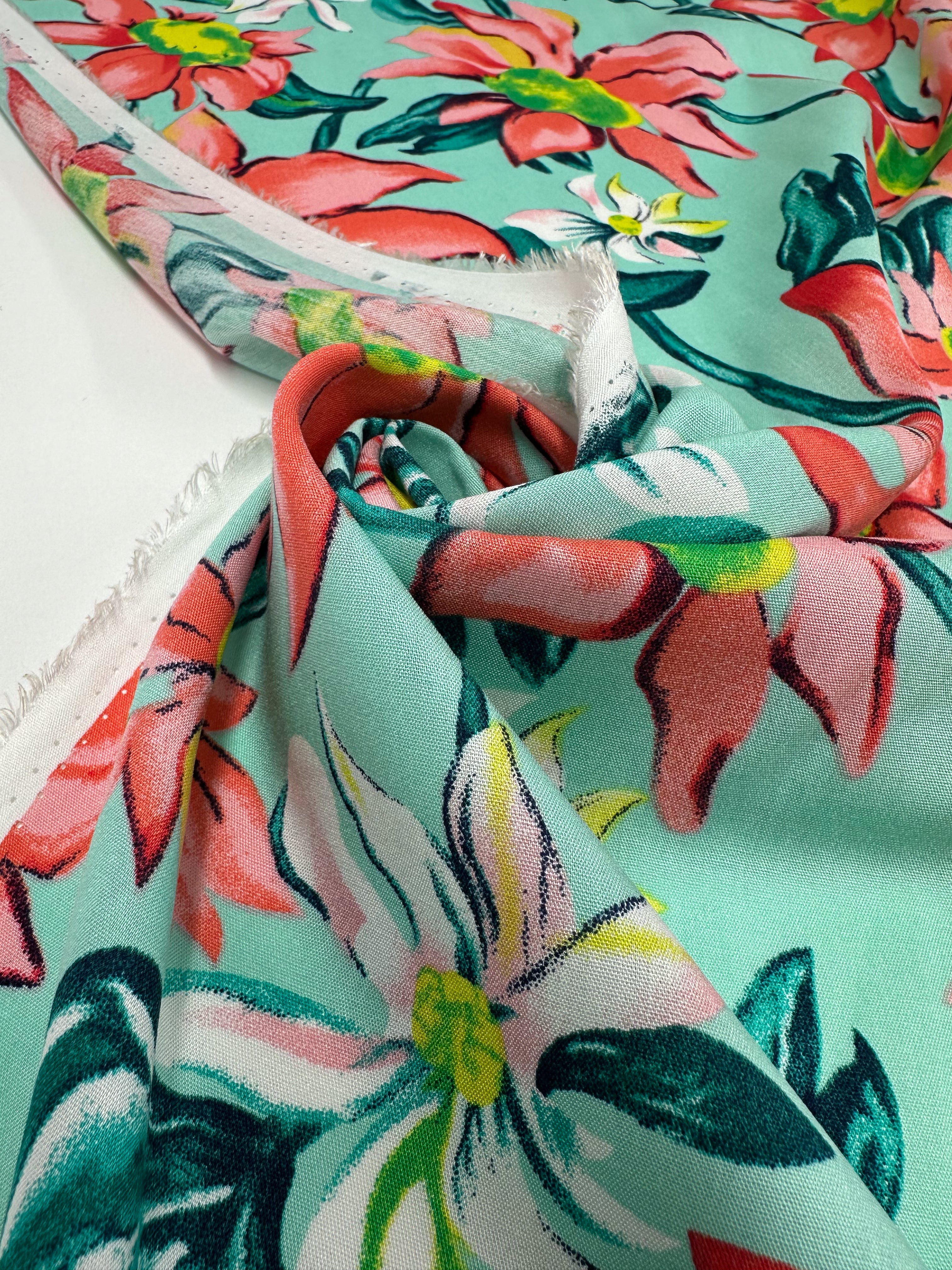 A close-up of Super Cheap Fabrics’ Designer Rayon - Tropical Blossom (145cm), showing colorful floral patterns with large pink, white, and yellow flowers plus green leaves on light turquoise, partially folded to reveal texture and selvage.