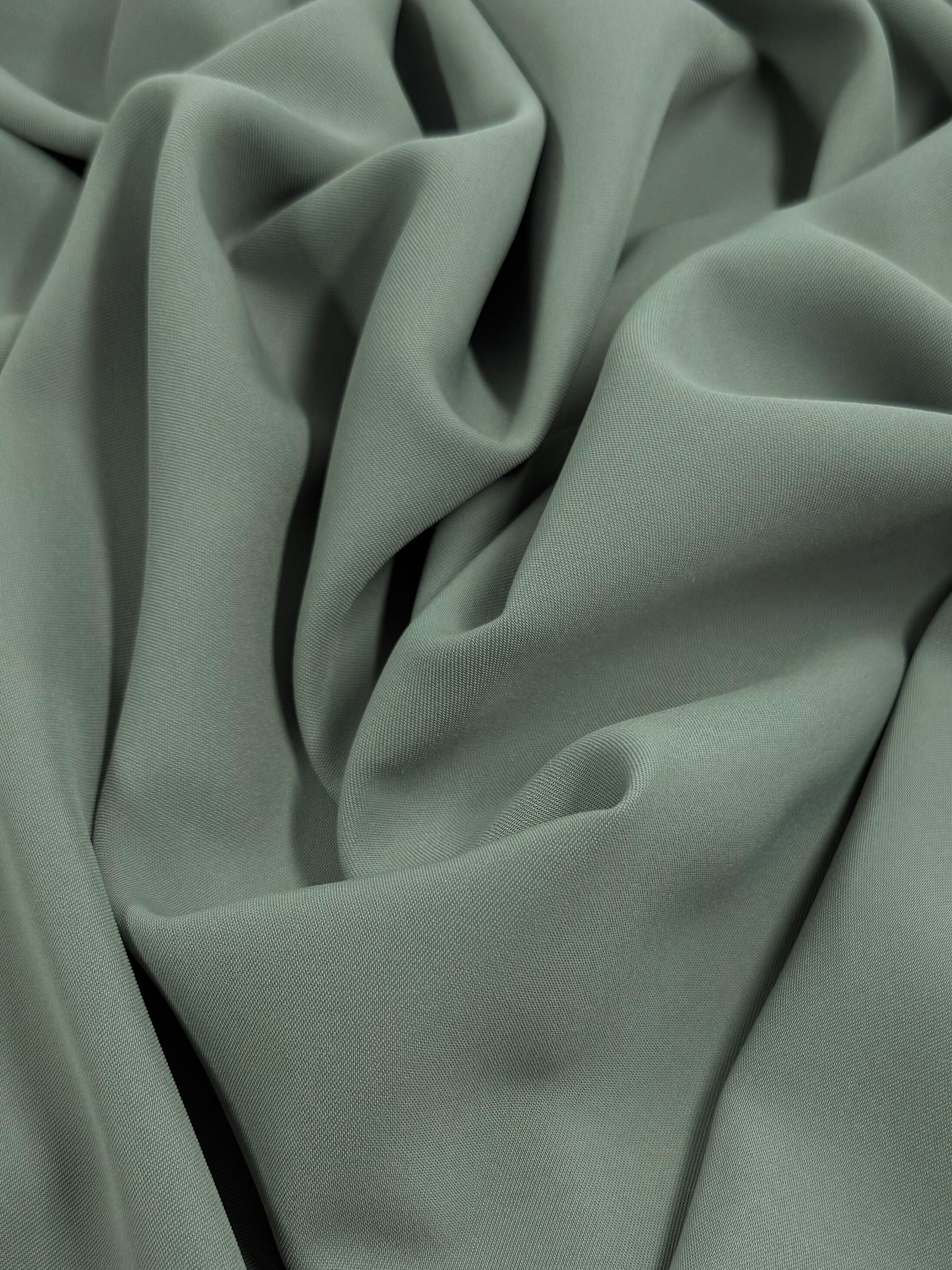 Super Cheap Fabrics' Microfibre Suiting in Dried Sage, 150cm wide, is smoothly textured and loosely draped, forming soft folds and gentle shadows.