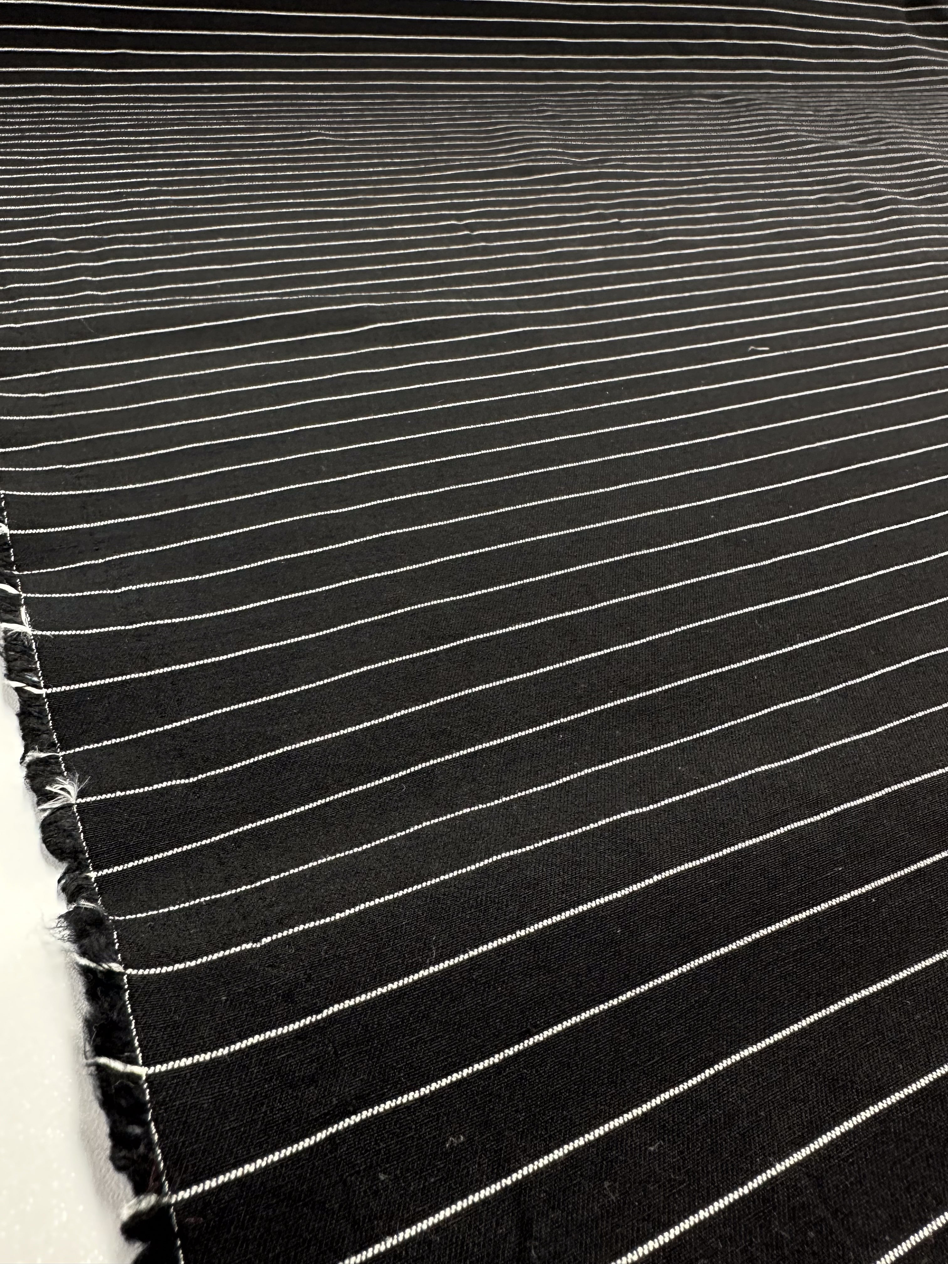 A close-up of Super Cheap Fabrics' Printed Bengaline in Ivory Pin Stripe showcases its subtle texture with thin, evenly spaced horizontal pinstripes on medium-weight black fabric. This 145cm stretch material is ideal for crafting skirts, dresses, pants, shorts, and jackets.