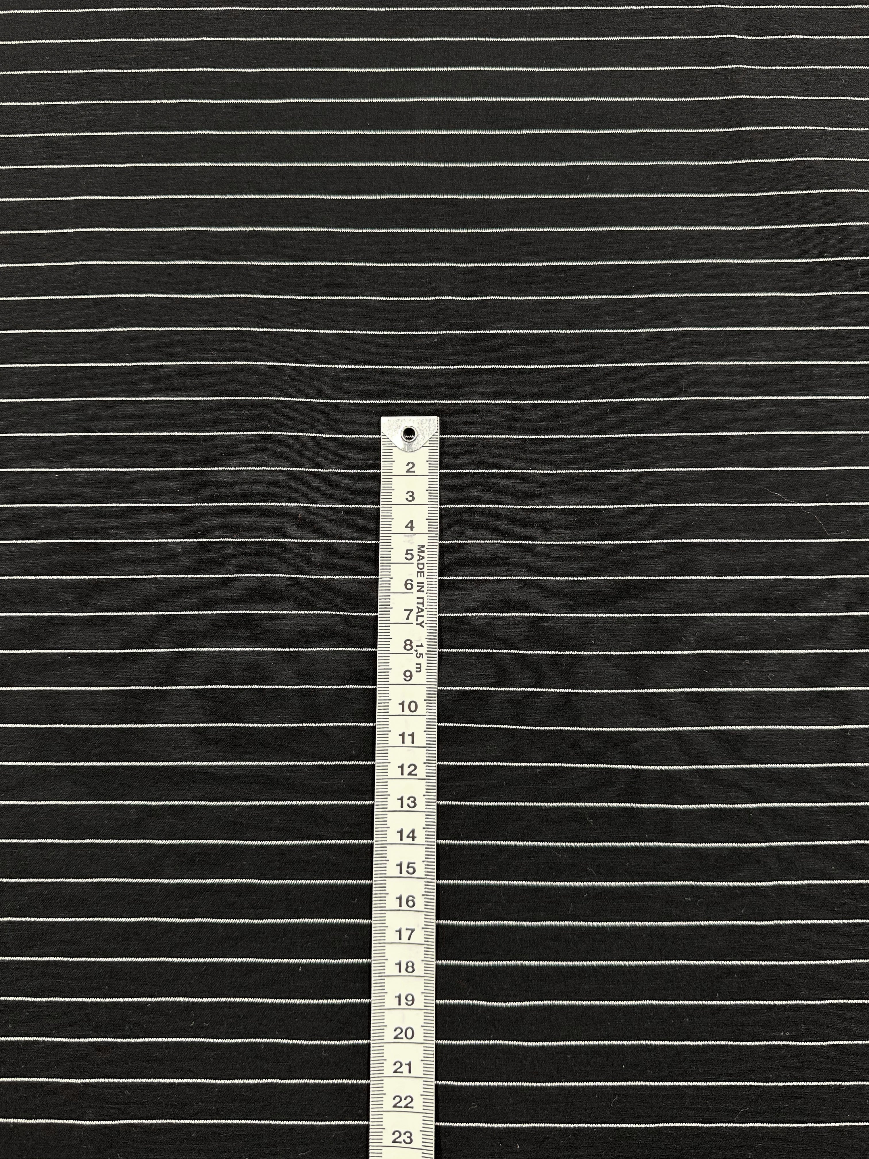 The Printed Bengaline - Ivory Pin Stripe from Super Cheap Fabrics features a black medium-weight, stretch fabric with thin white horizontal stripes and a vertical tape measure reaching 14 inches—ideal for crafting stylish skirts or pants with a sleek fit. Width: 145cm.