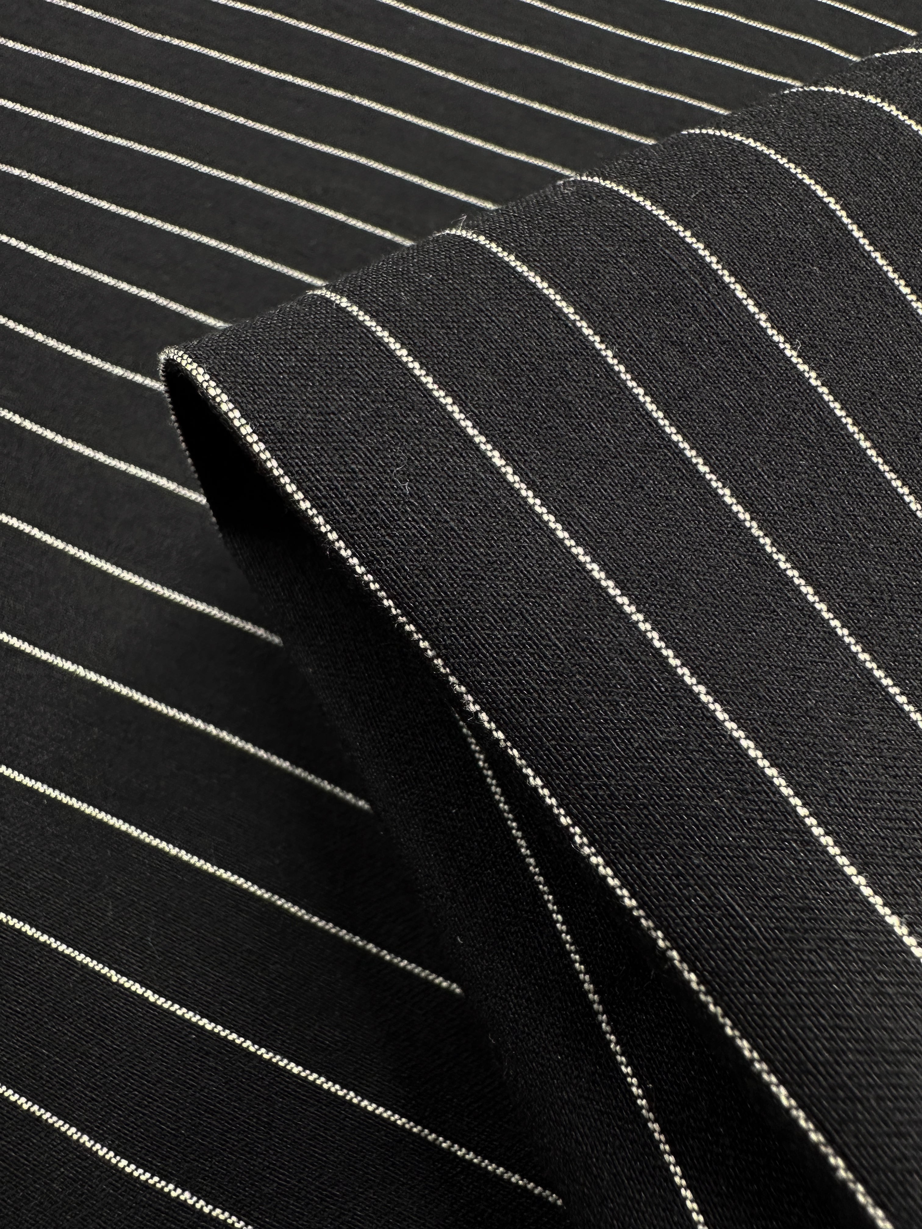 Close-up of the Super Cheap Fabrics' Printed Bengaline in Ivory Pin Stripe, 145cm. The black stretch fabric features finely spaced white stripes, ideal for skirts, dresses, pants, shorts, or jackets with its smooth and medium-weight texture.