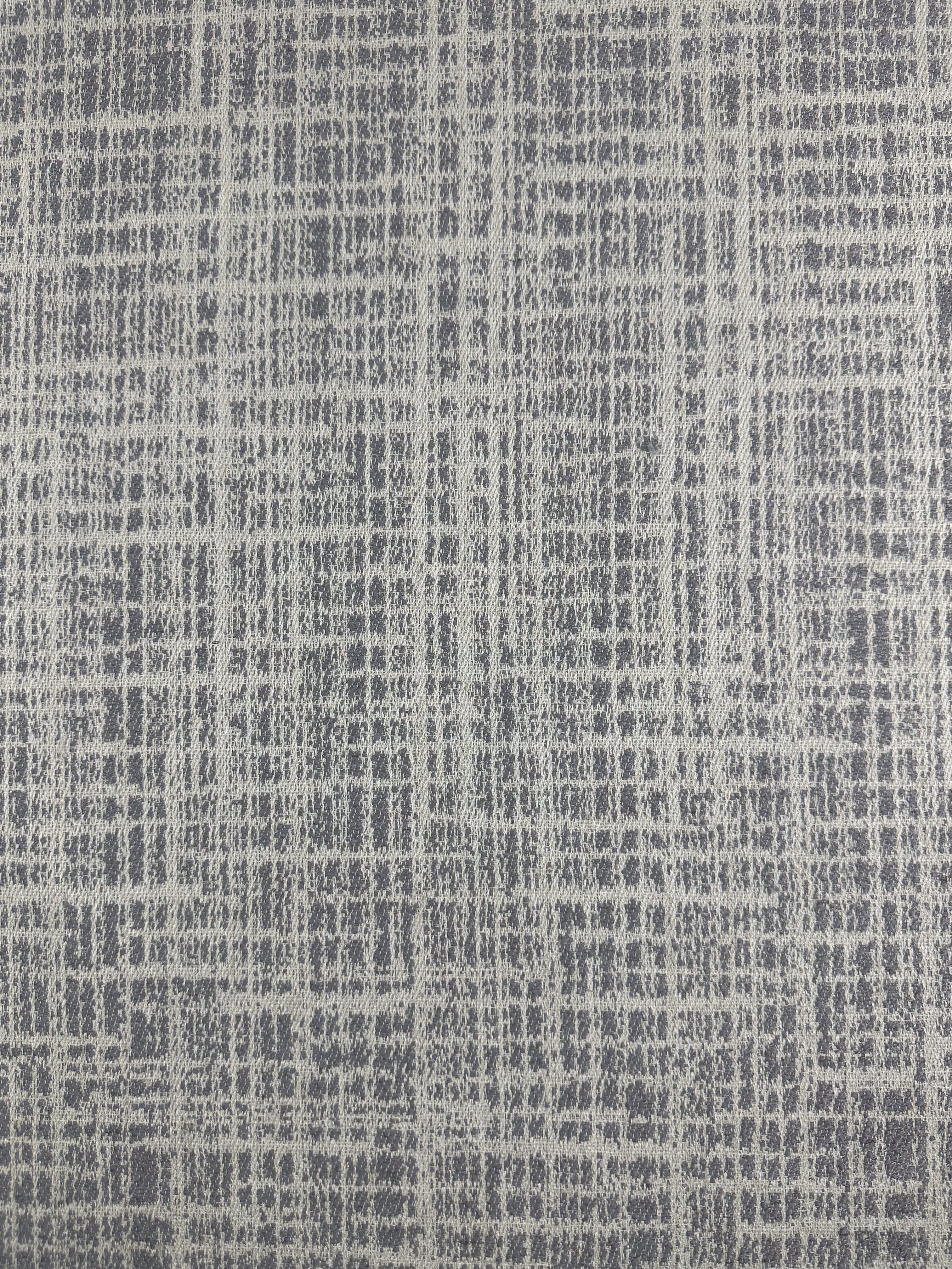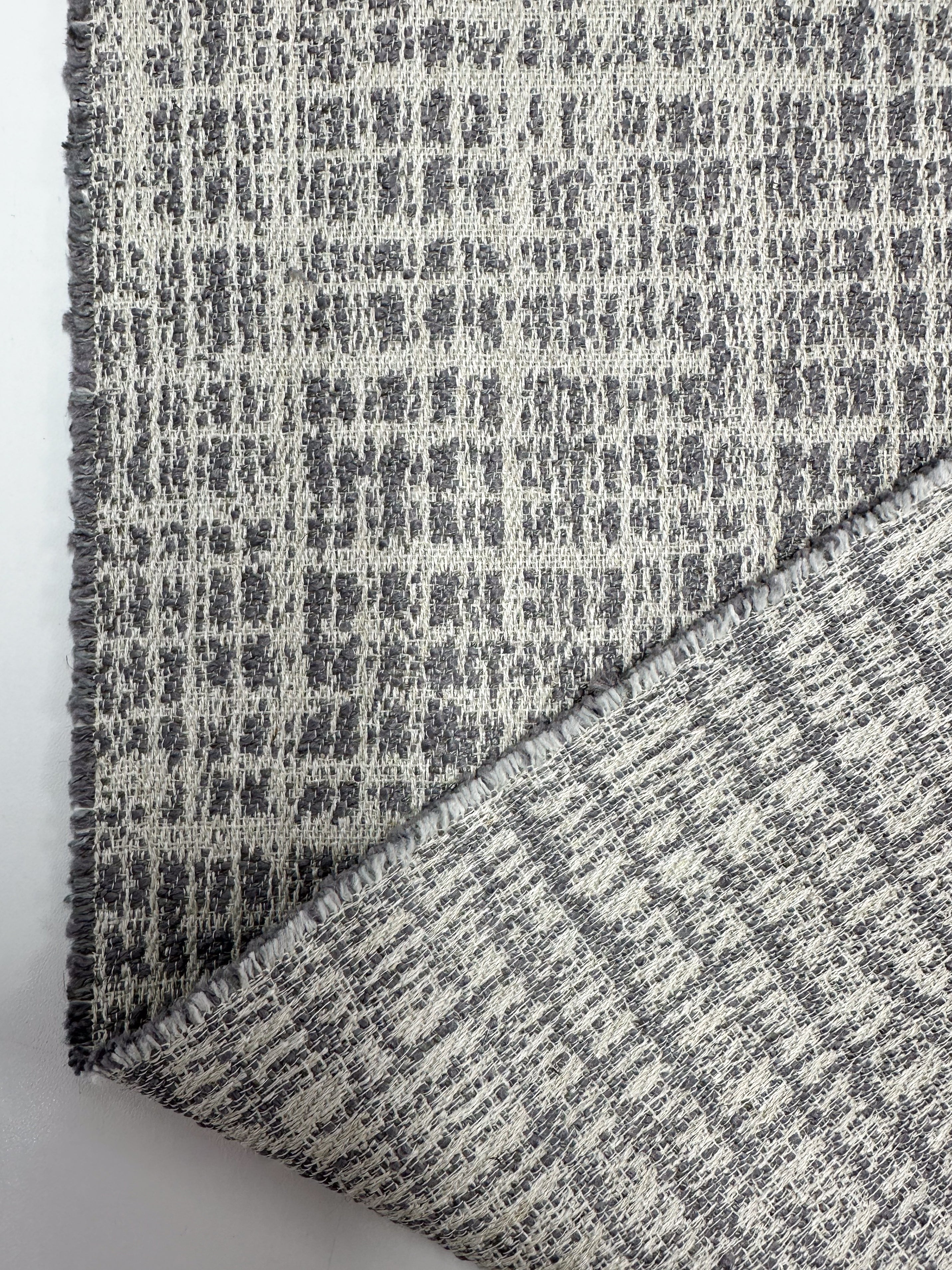 A close-up of Super Cheap Fabrics’ Textured Weave Upholstery - Dexter 33 Dove (147cm), showing its gray and white irregular geometric pattern, folded to display the fabric’s thickness and detailed weave.